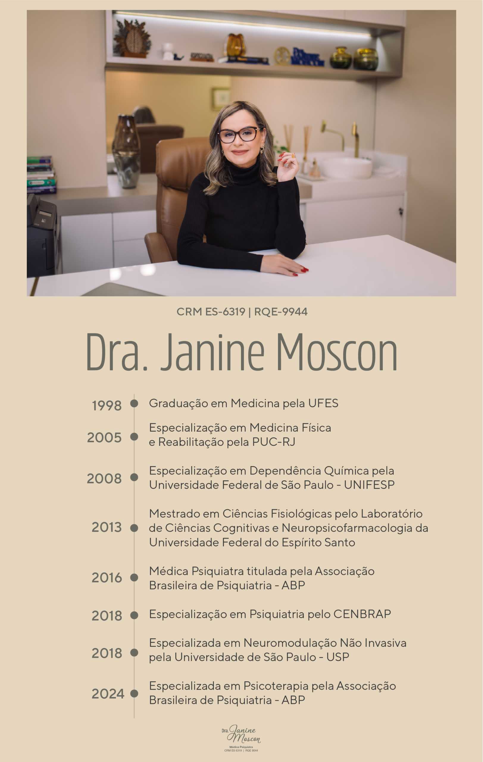 Prazer sou a Dra. Janine Moscon, uma psiquiatra dedicada que busca tratamentos inovadores para mudar a vida dos meus pacientes. Com 25 anos de atuação, tenho vasta experiência em ajudar pessoas a superar seus desafios emocionais. Com uma abordagem compassiva e personalizada, me comprometo em fornecer o melhor cuidado possível a você.